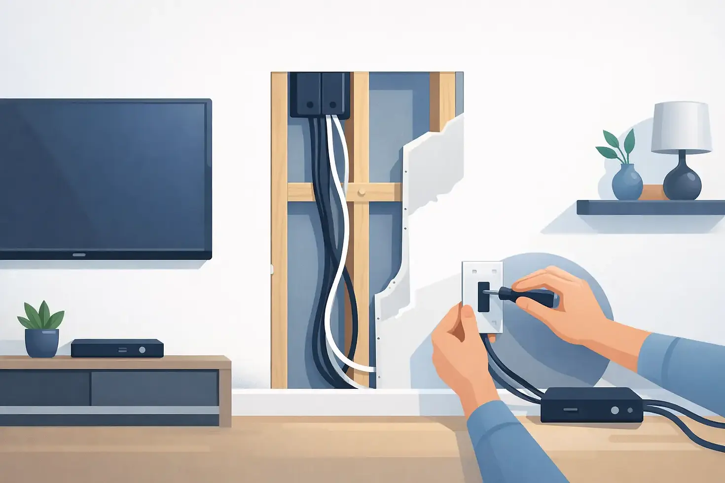 If you're set on doing it yourself, the process sounds simple on paper. Locate the studs, choose the wall openings, cut the access points, fish the cables through the cavity, and install the recessed boxes or cable pass-throughs.